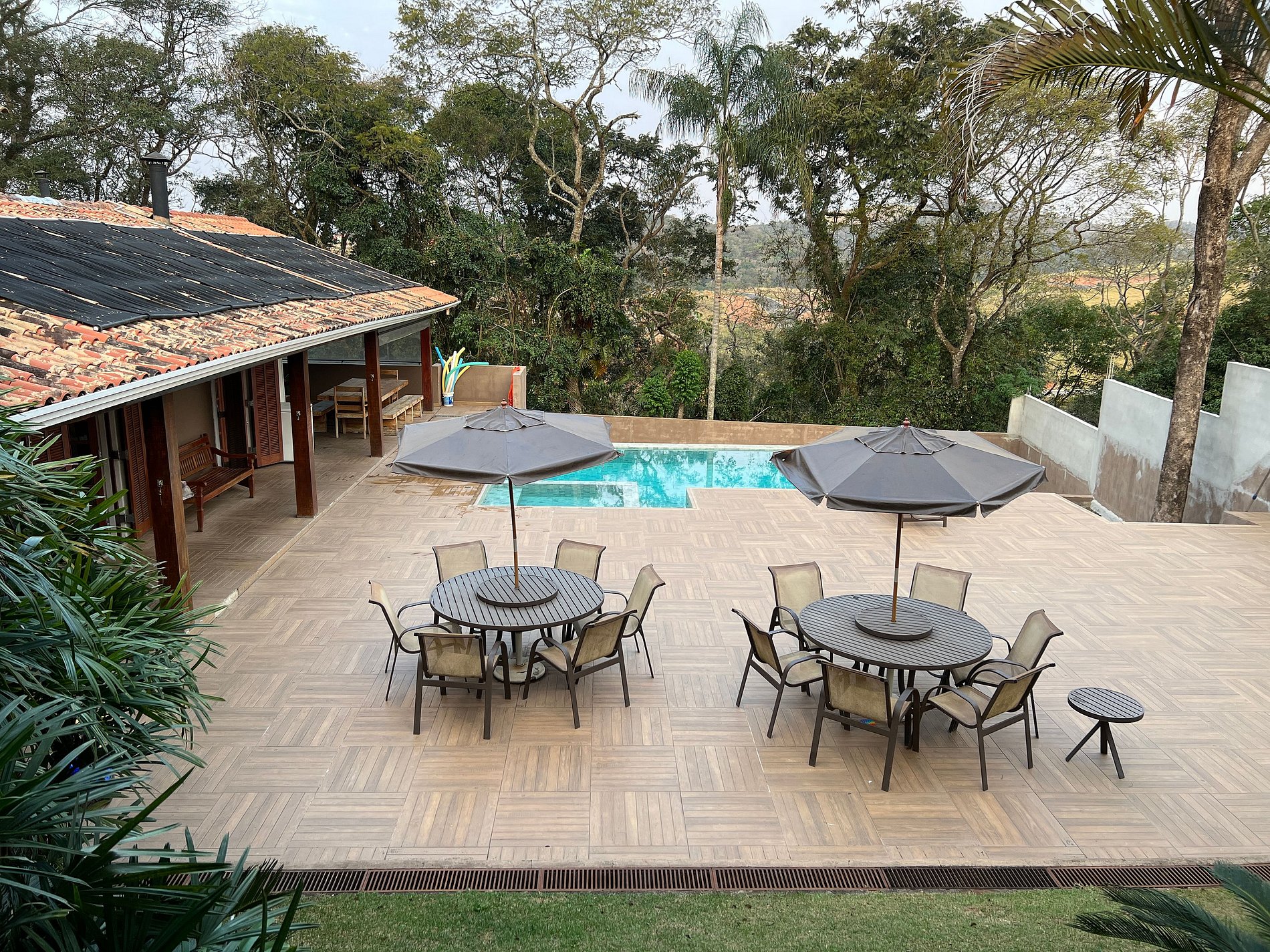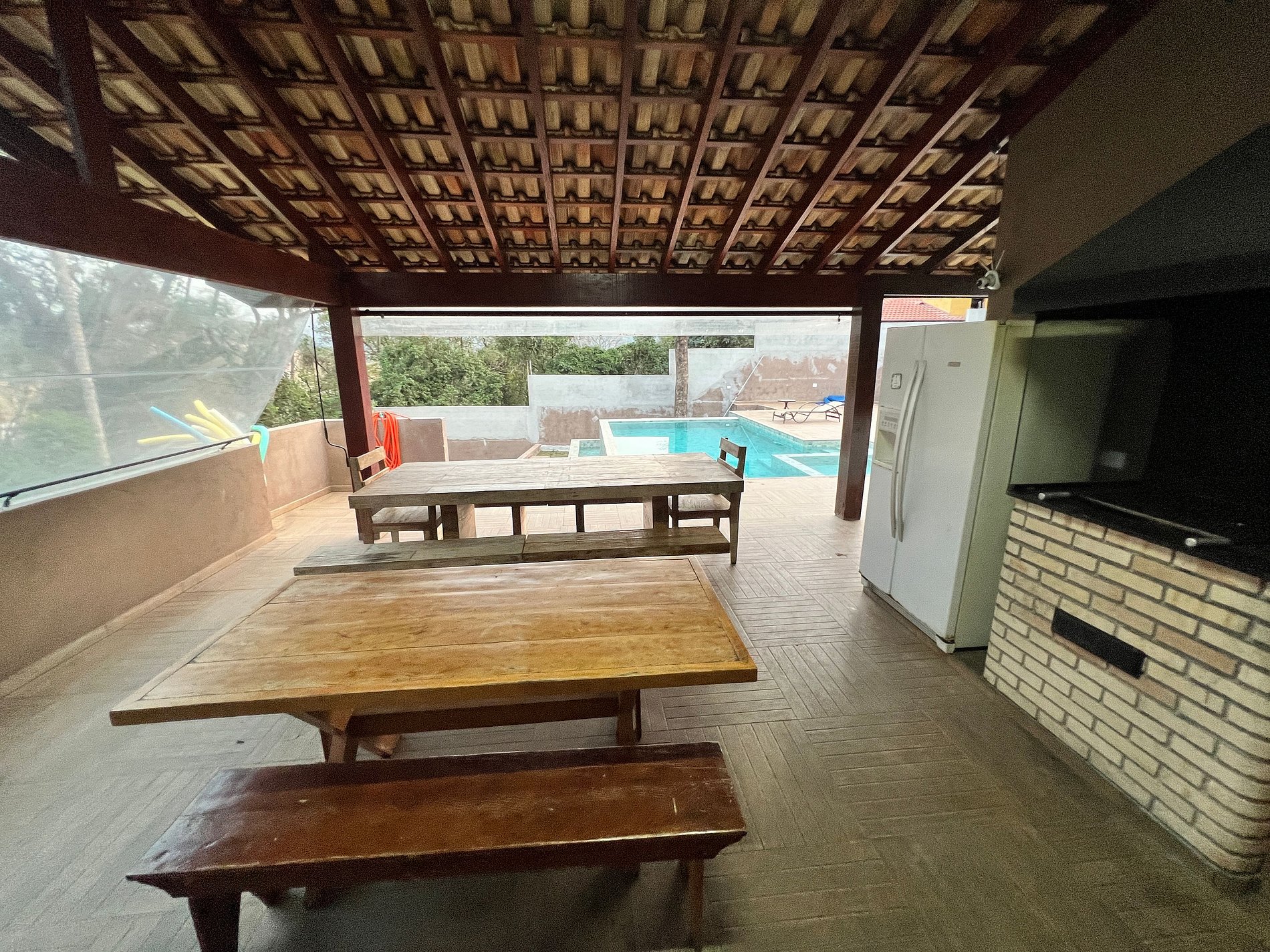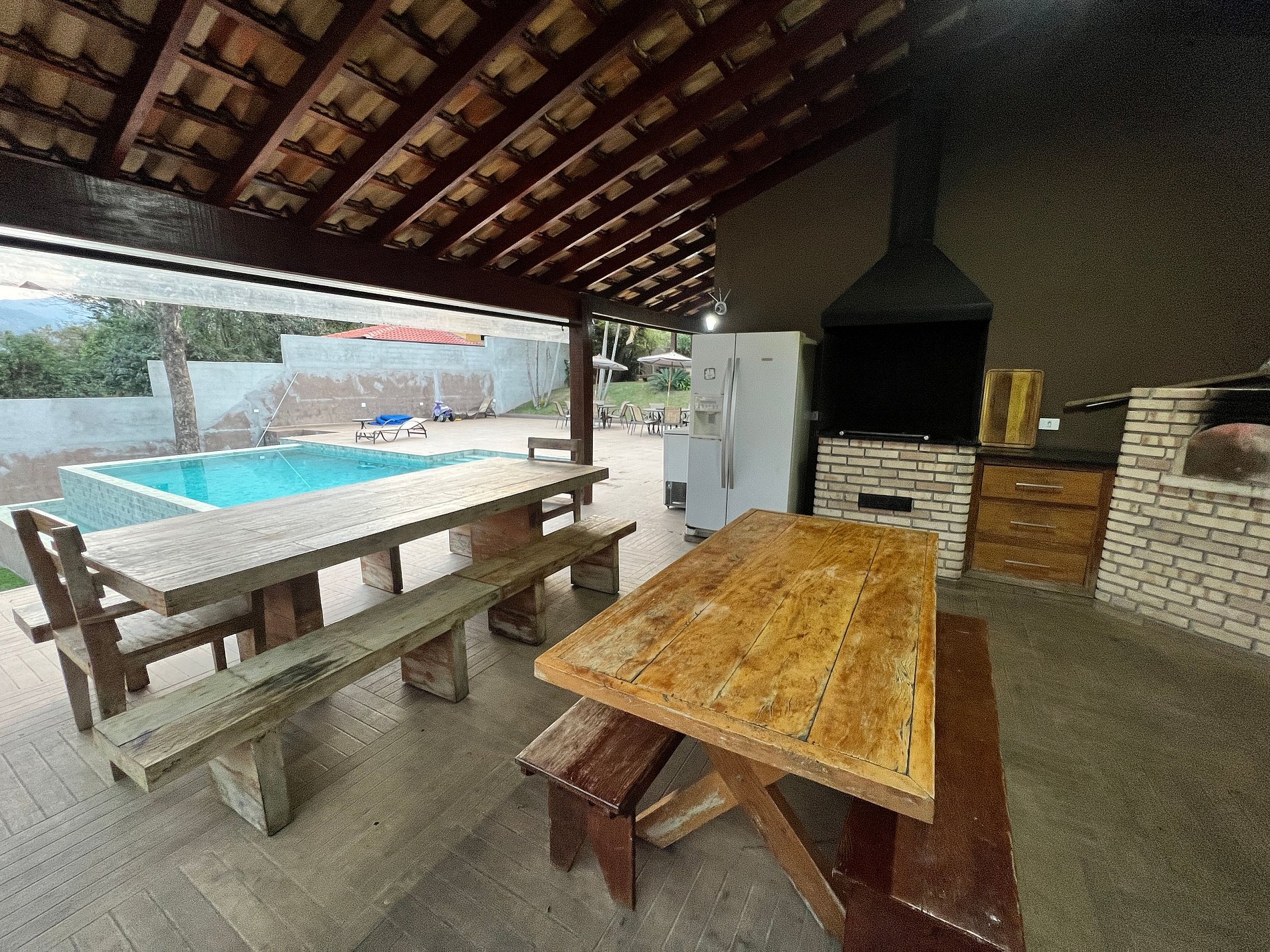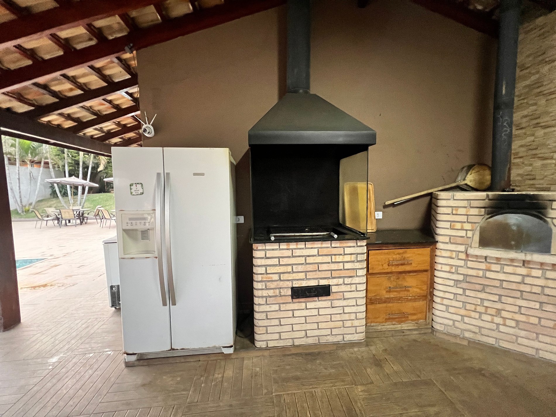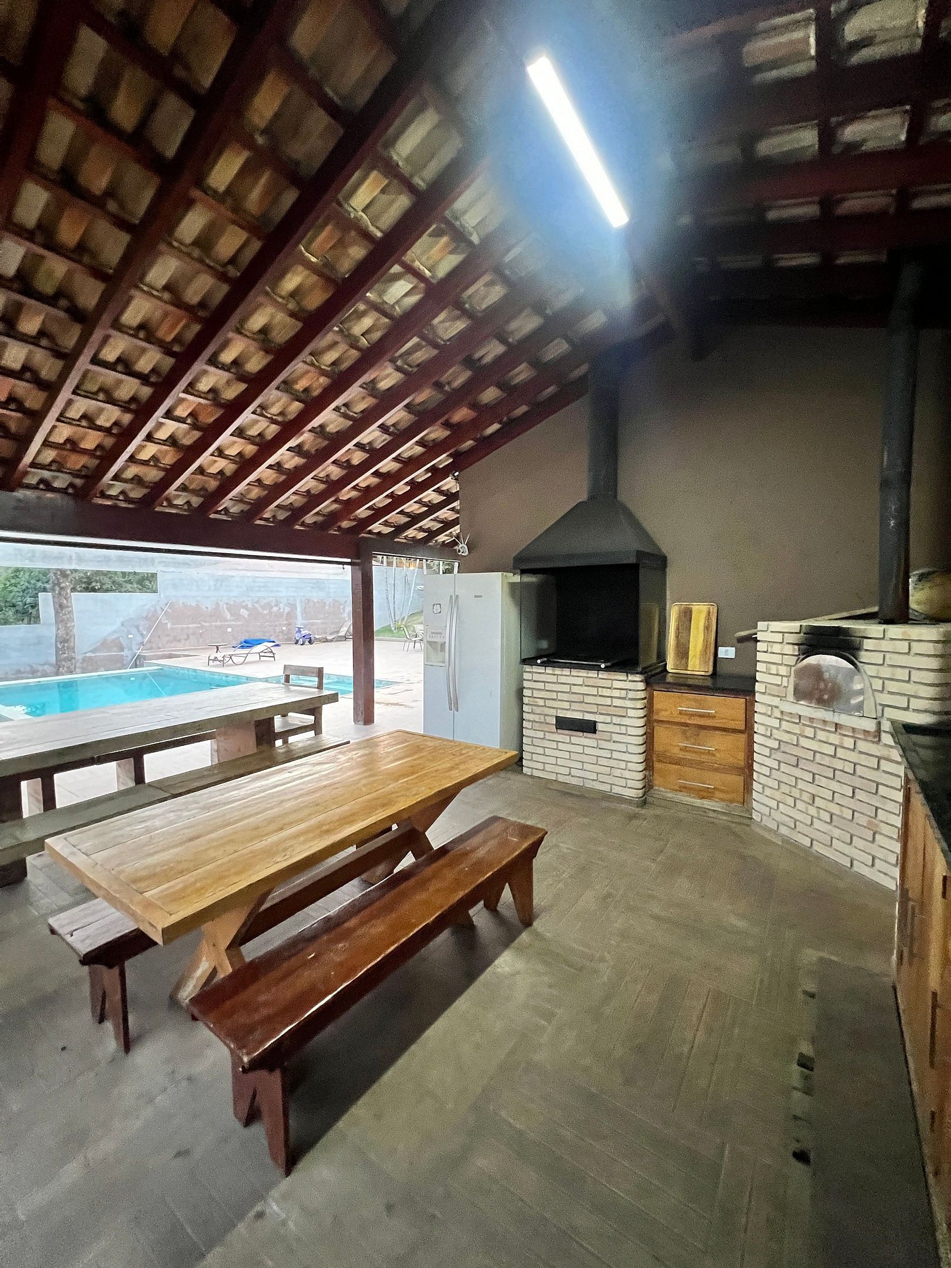 Varanda externa c/ churrasqueira, forno de pizza, fogão à lenha; Piscina aquecida c/ aquecimento solar, borda infinita e luzes