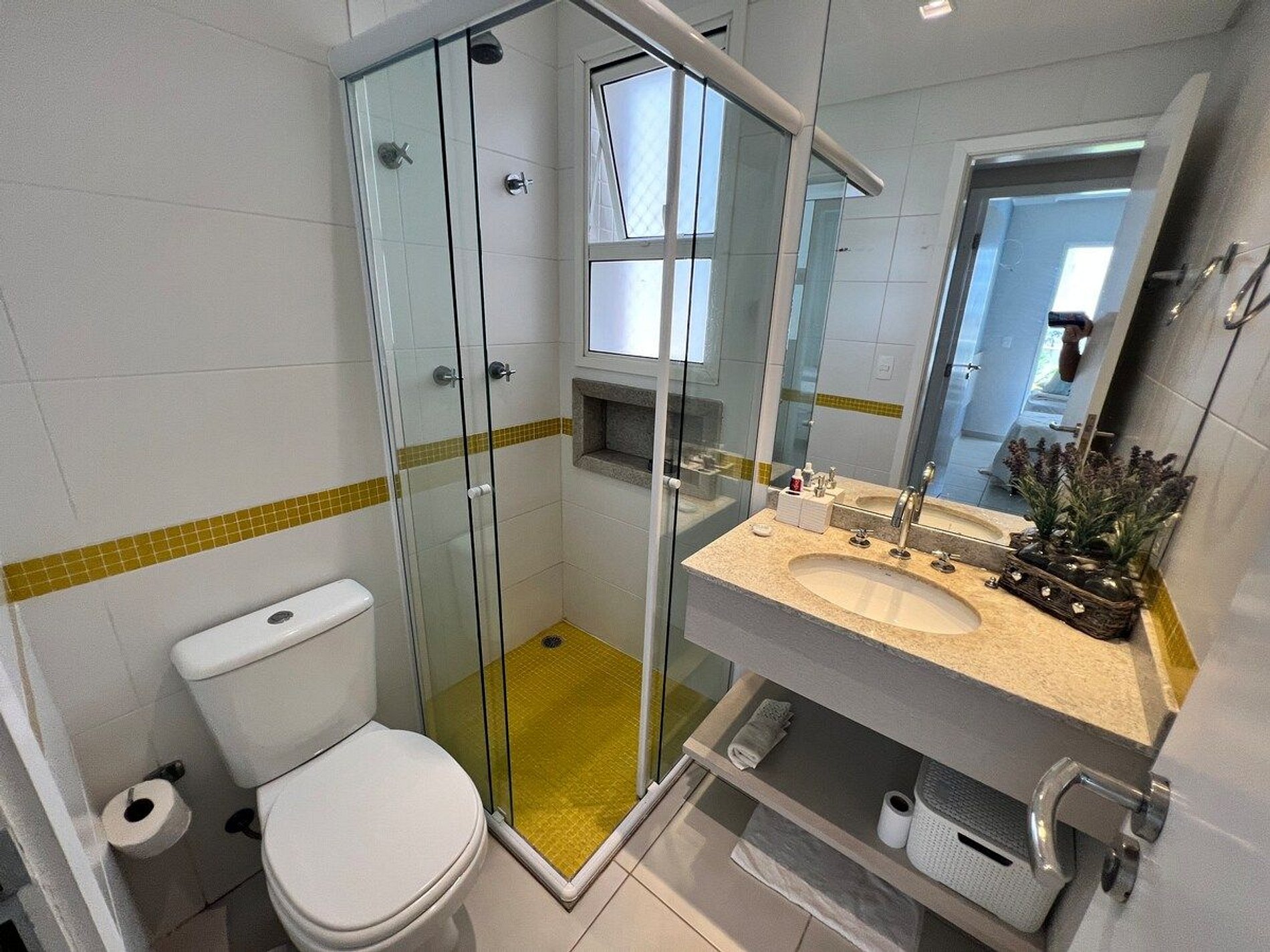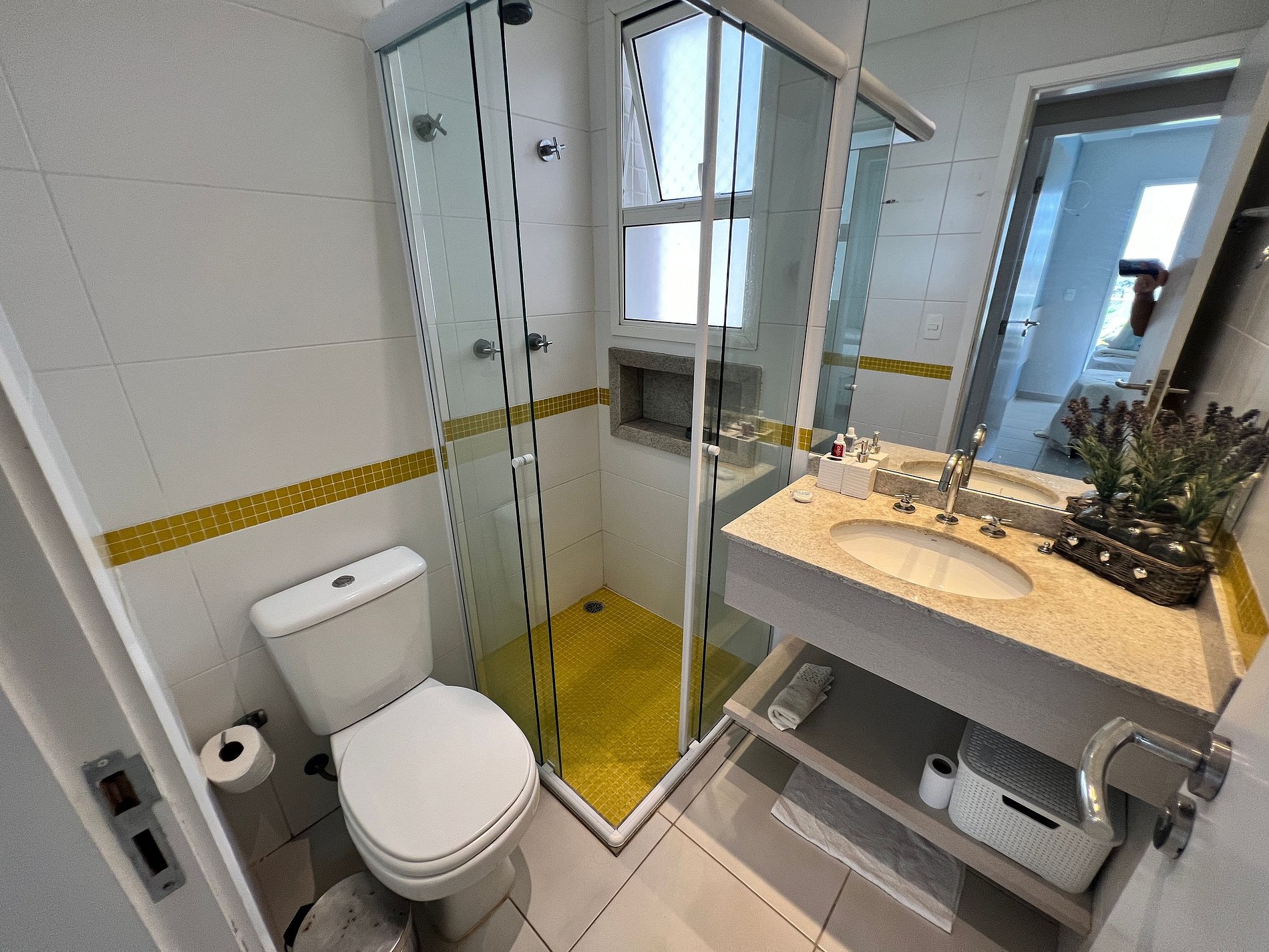 Home 45 Bertioga | Apto 96m2 c/ varanda gourmet, acomoda até 8 pessoas nos 3 quartos (2 suítes); Ar condicionado na sala e nas súites; Vista p/ o mar; Ventilador de teto em todos os cômodos;