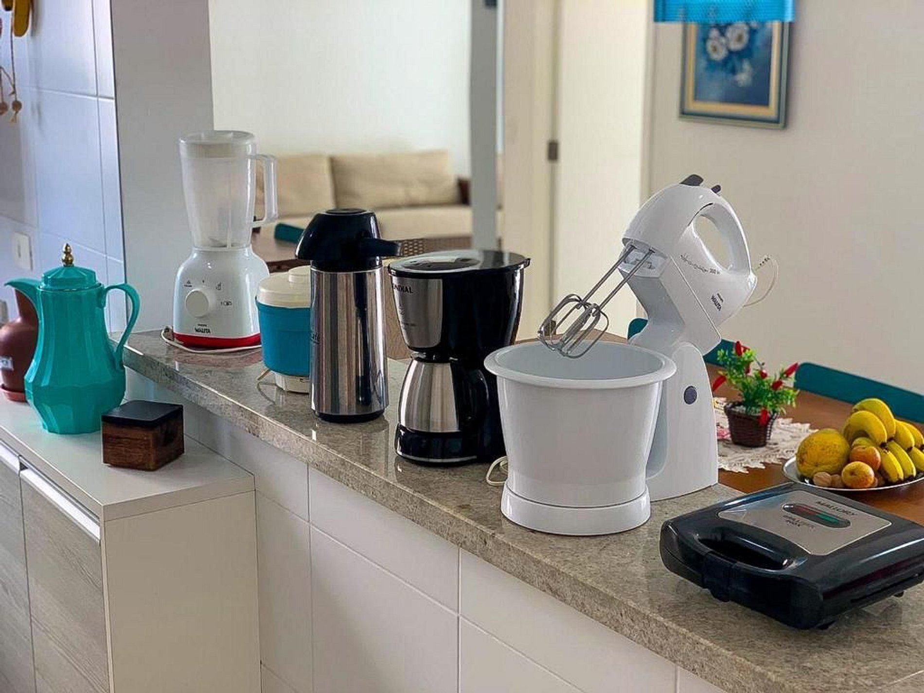 *Eletrodomésticos/Utensílios: Filtro de água; lancheira; garrafa térmica; cooler; espremedor de laranjas; batedeira; cafeteira elétrica; microondas; forno; liquidificador; fogão; geladeira e todos os utensílios essenciais de cozinha, inclusive para churrasco; área de serviço com tanque, varal de roupas e máquina de lavar; ferro de passar roupa; produtos de higiene pessoal (papel higiênico e sabonete limitados).
