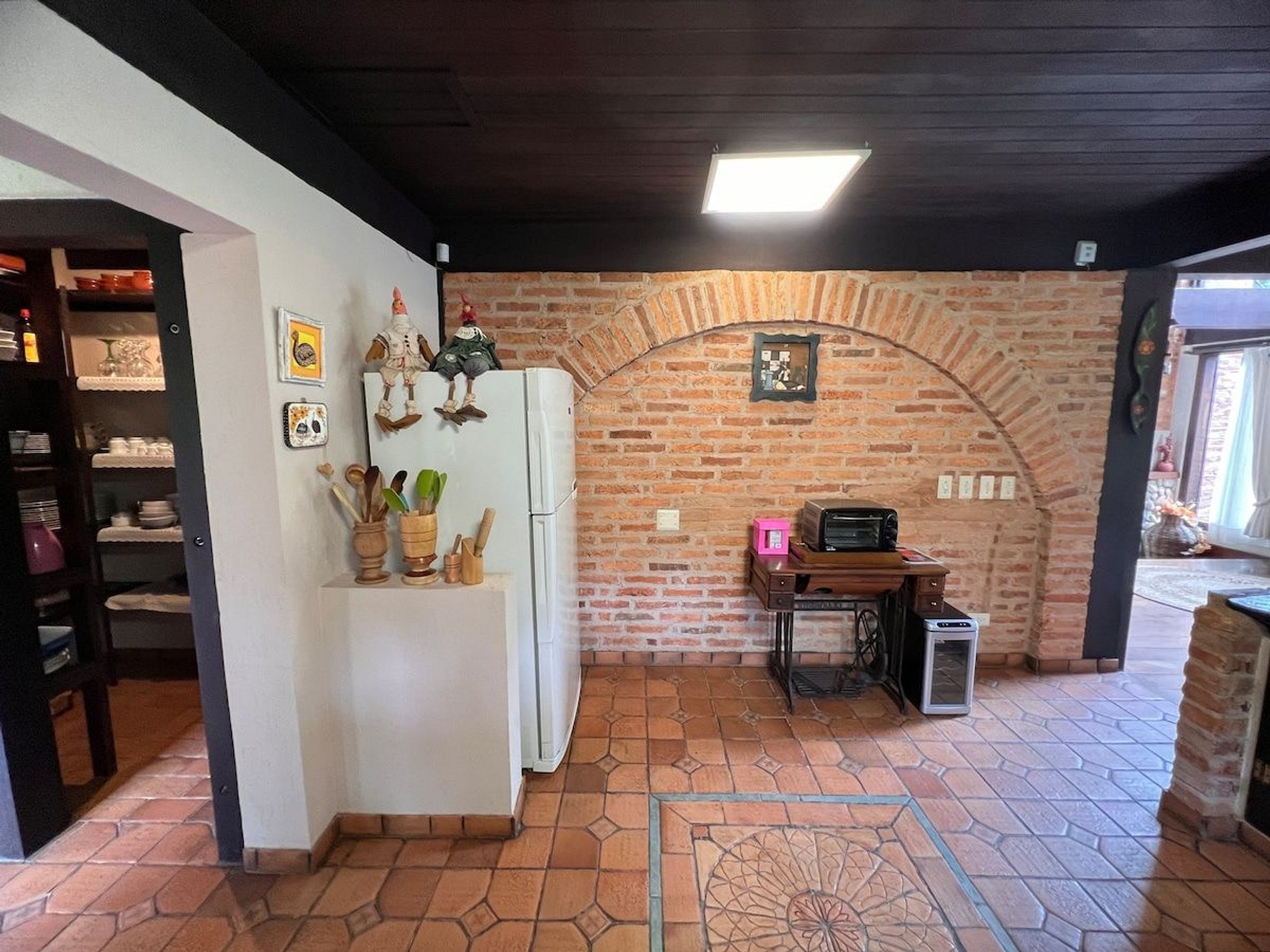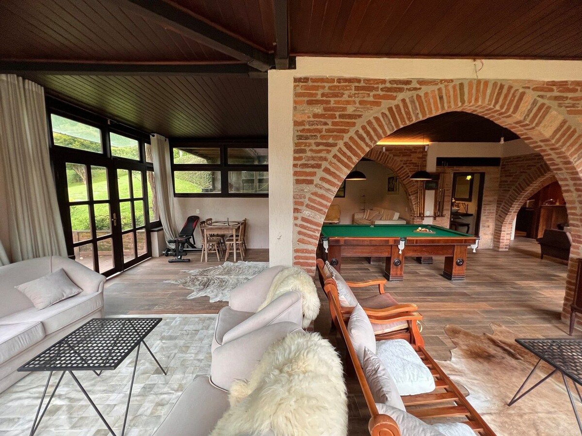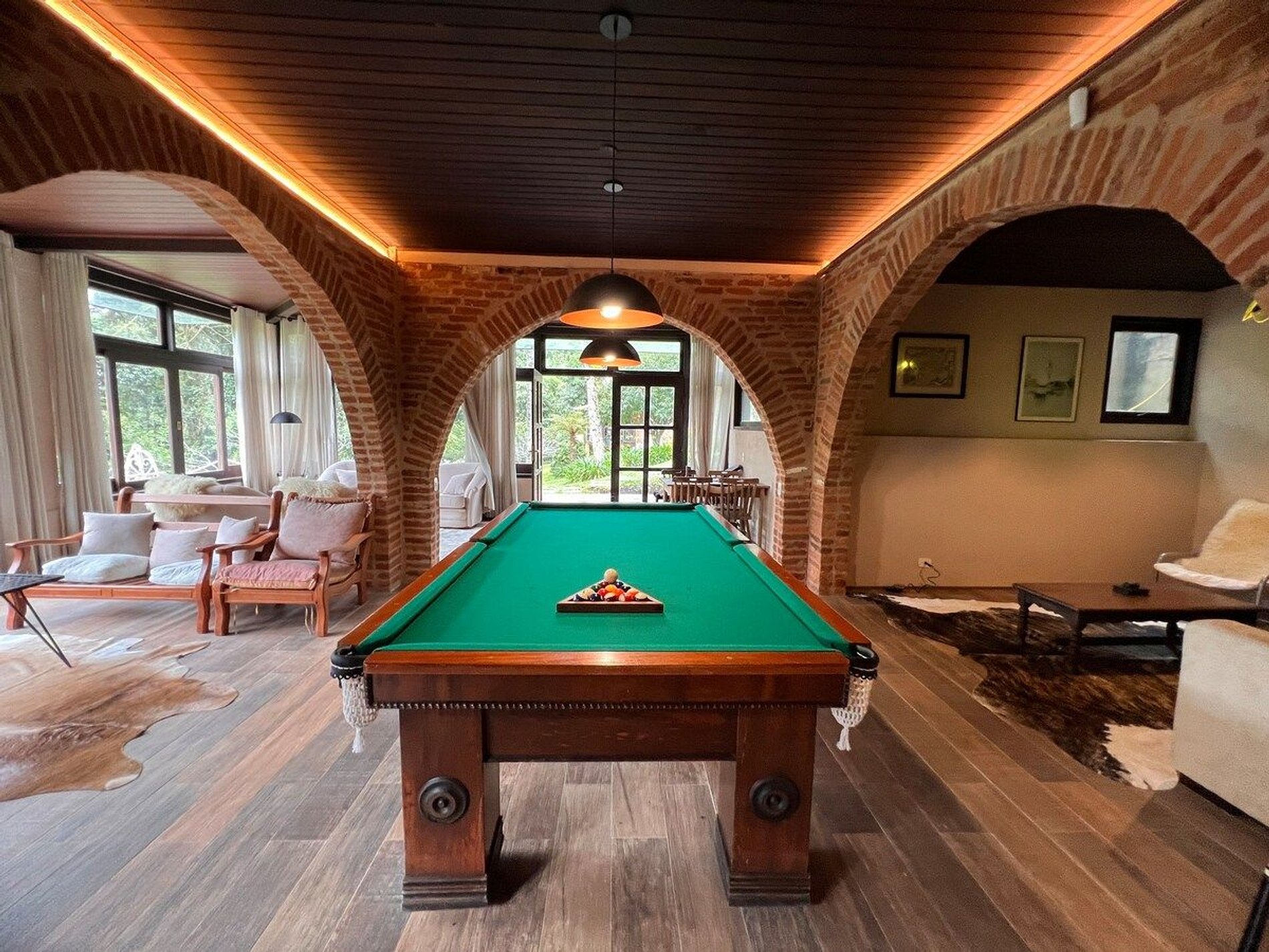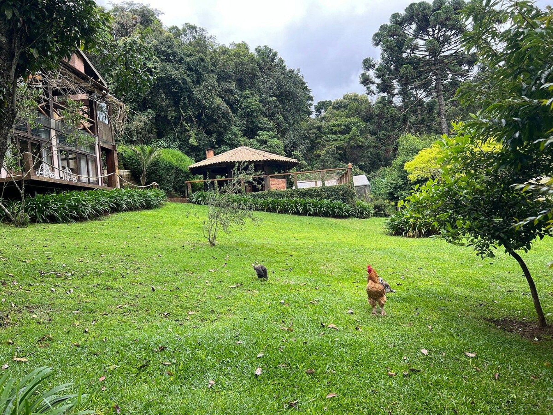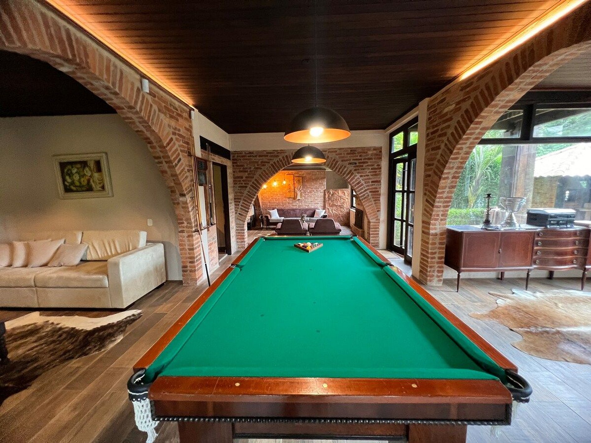 Cozinha estilo americana, copa com louças, travessas, copos e taças. No salão do jardim uma excelente mesa de bilhar, sala intima com lareira, um bar com Cave para adega compõem um ambiente que remete às vinícolas europeias. Com acesso direto ao deck e ao quiosque gourmet, o hóspede tem acesso ao fogão a lenha, forno de pizza, churrasqueira a carvão e à churrasqueira de bafo. Ôfuro Japonês no jardim privativo, possui ambiente para fogueira, laguinho, saída privativa para a trilha da reserva do condomínio(caminhada na floresta). Com acesso direto ao deck e ao quiosque gourmet, o hóspede tem acesso ao fogão a lenha, forno de pizza, churrasqueira a carvão e à churrasqueira de bafo.