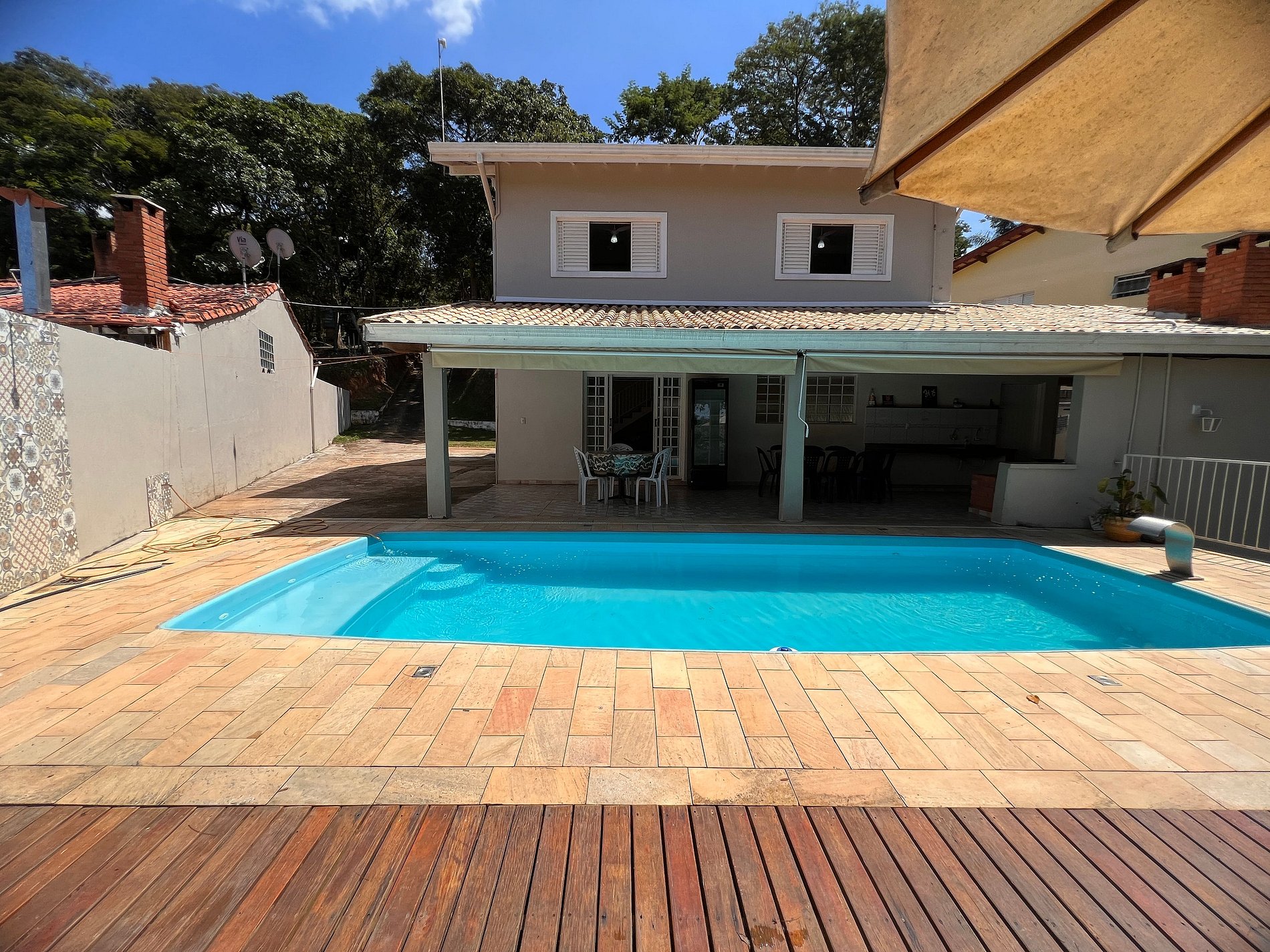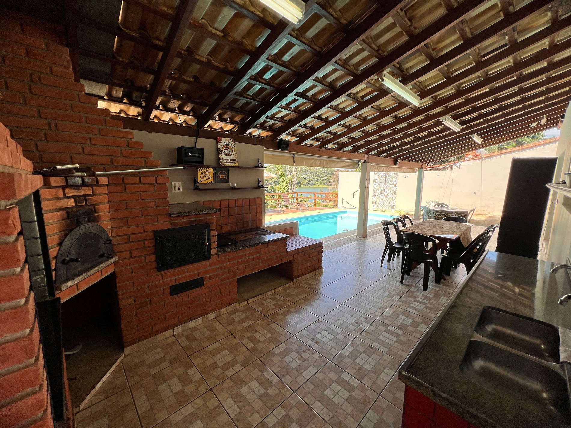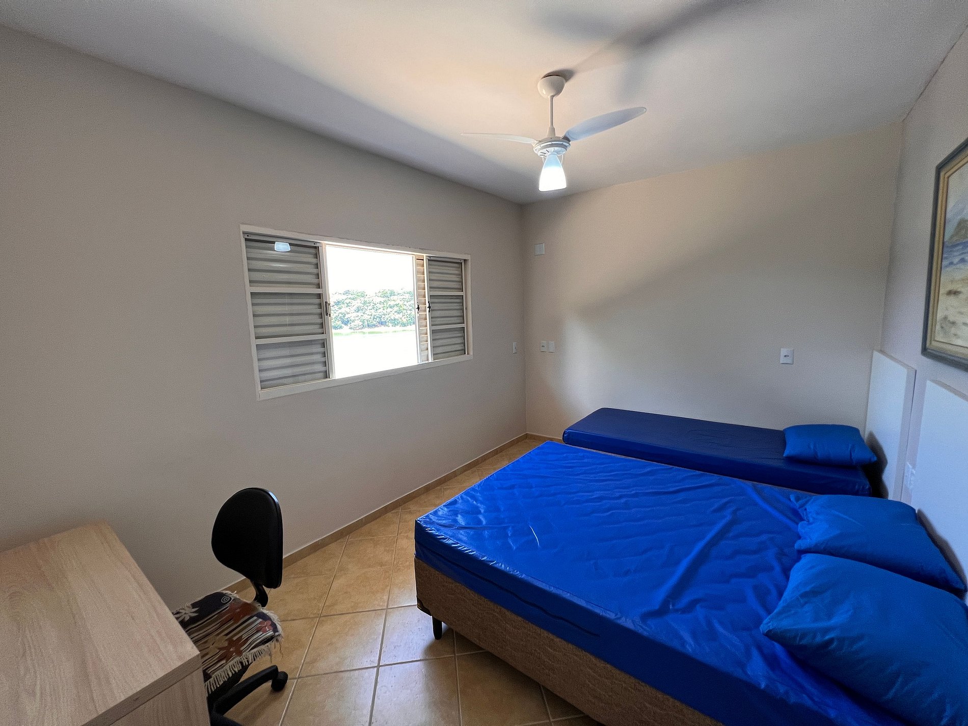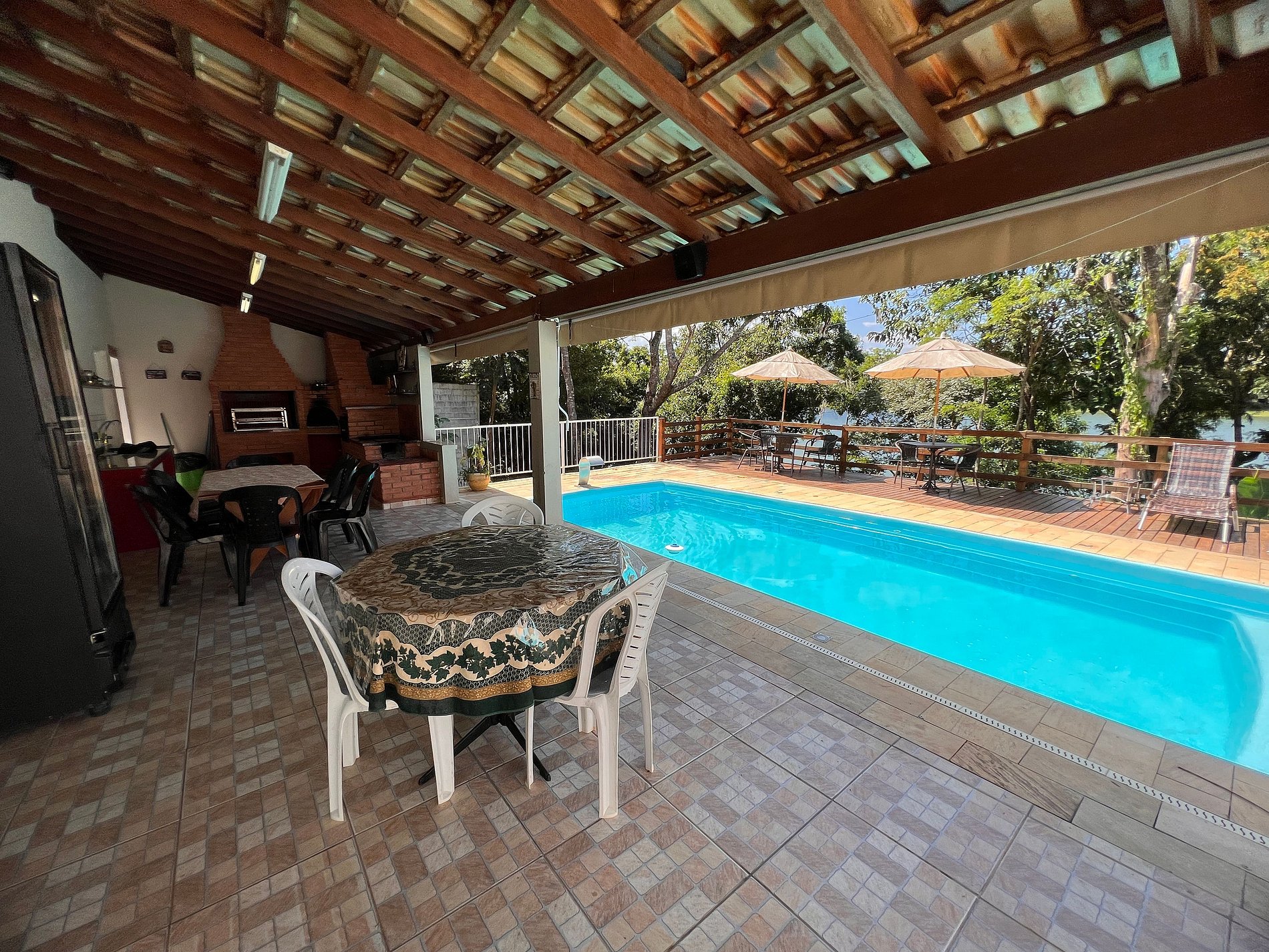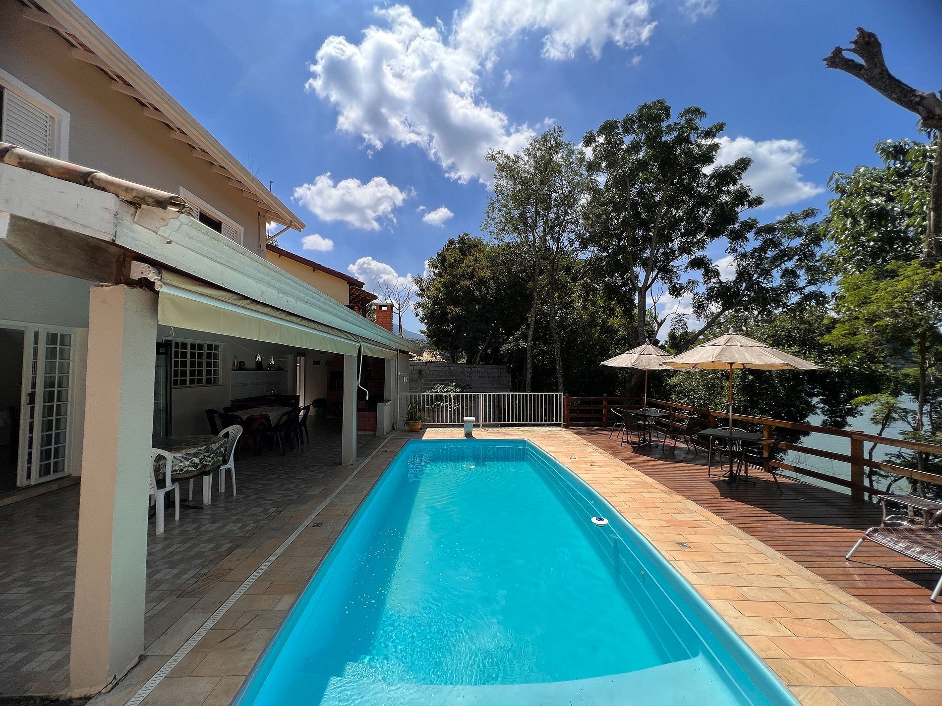 Casa de campo 200m2, acomoda até 12 pessoas (mediante taxa de hospede extra a partir do 9°); 3 quartos, sendo todos no piso superior; Piscina privativa aquecida, com aquecimento solar e sem proteção para crianças; Vista para as montanhas e lago de pesca; Área gourmet c/ churrasqueira, forno de pizza e fogão a lenha ao lado piscina; Acesso a rampa de Jetski próximo; TV canais abertos; Internet c/ WI-FI 600megas; 1 pet cortesia: consulte (2+ consulte taxa); Vaga p/ 5 carros