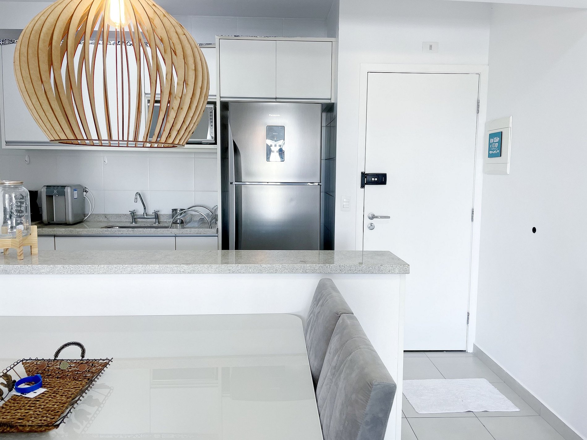 *Eletrodomésticos/Utensílios: Filtro de água; lancheira; garrafa térmica com suporte para coador; cafeteira elétrica; microondas; forno; liquidificador; fogão; geladeira; taças e todos os utensílios essenciais de cozinha, inclusive para churrasco; tanque; ferro de passar e varal de roupas; máquina lava e seca; secador de cabelo; cabides; produtos de higiene pessoal (papel higiênico e sabonete); álcool em gel.