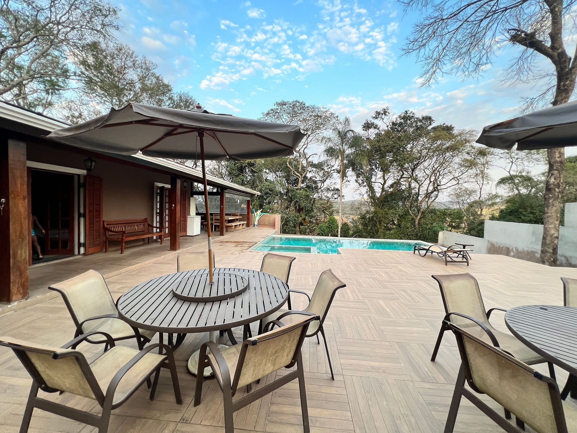 Varanda externa c/ churrasqueira, forno de pizza, fogão à lenha; Piscina aquecida c/ aquecimento solar, borda infinita e luzes