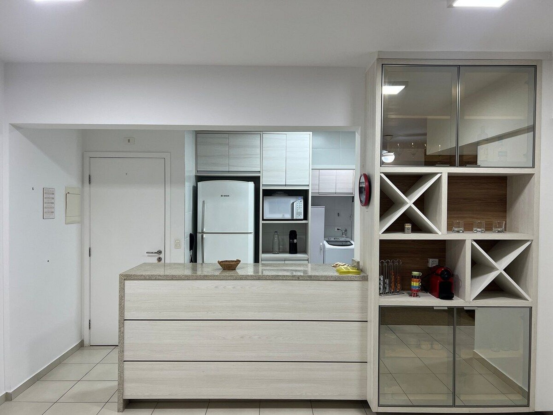 Fogão, forno, geladeira, micro-ondas, liquidificador, filtro de água, máquina de café (cápsulas), coador comum, garrafa térmica, assadeiras, taças, abridor de vinho, tábua de corte, utensílios de cozinha e churrasco.