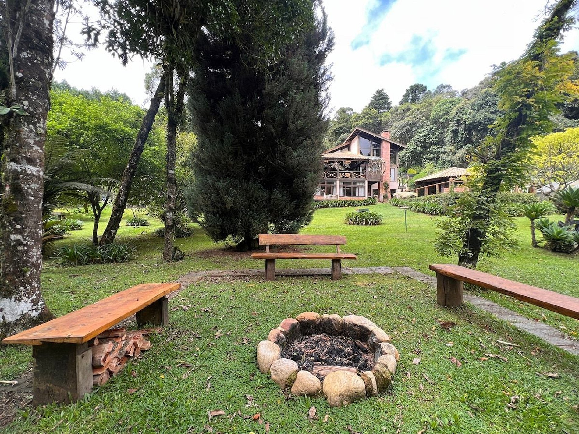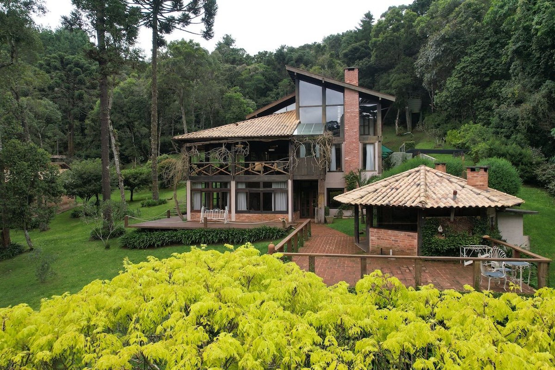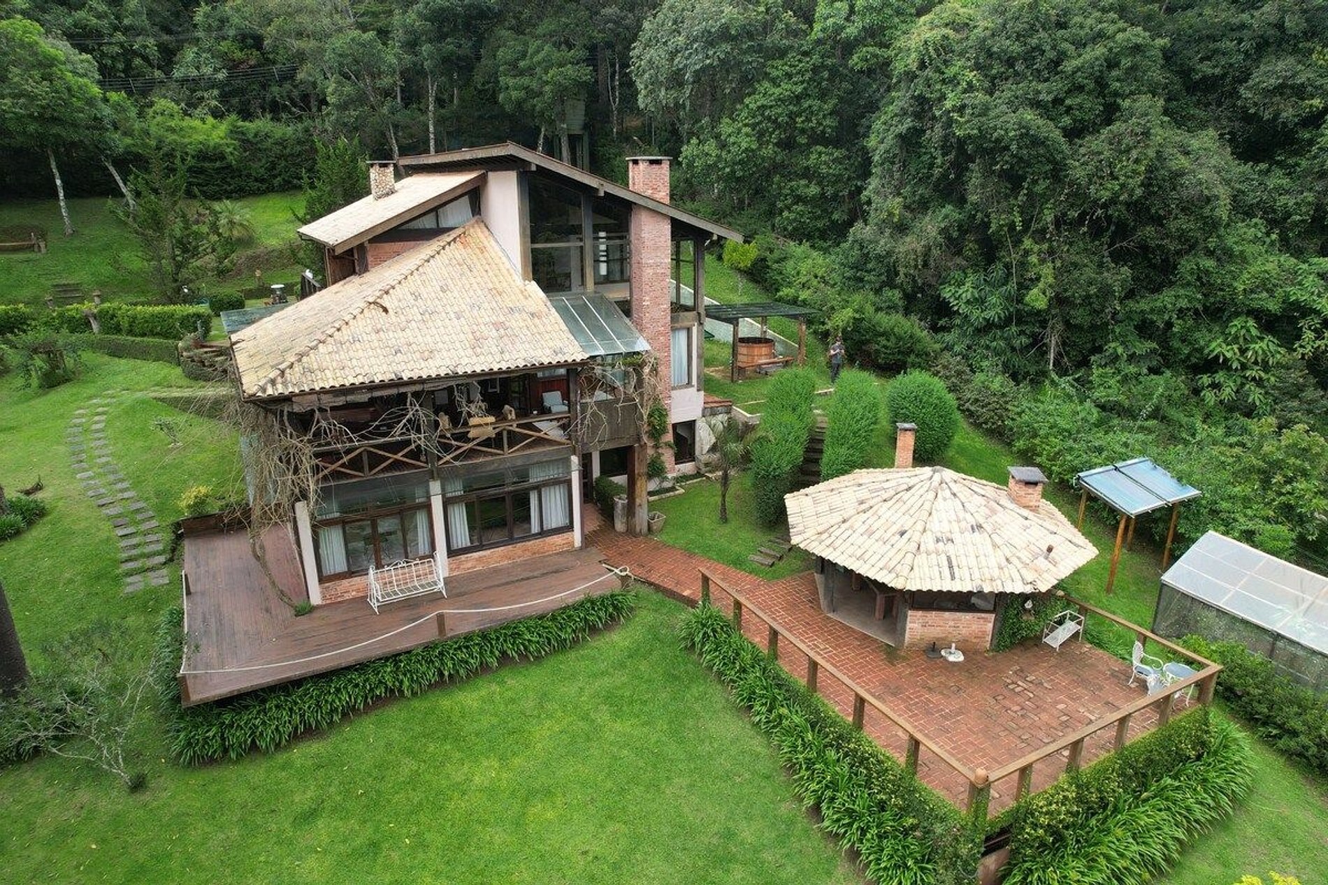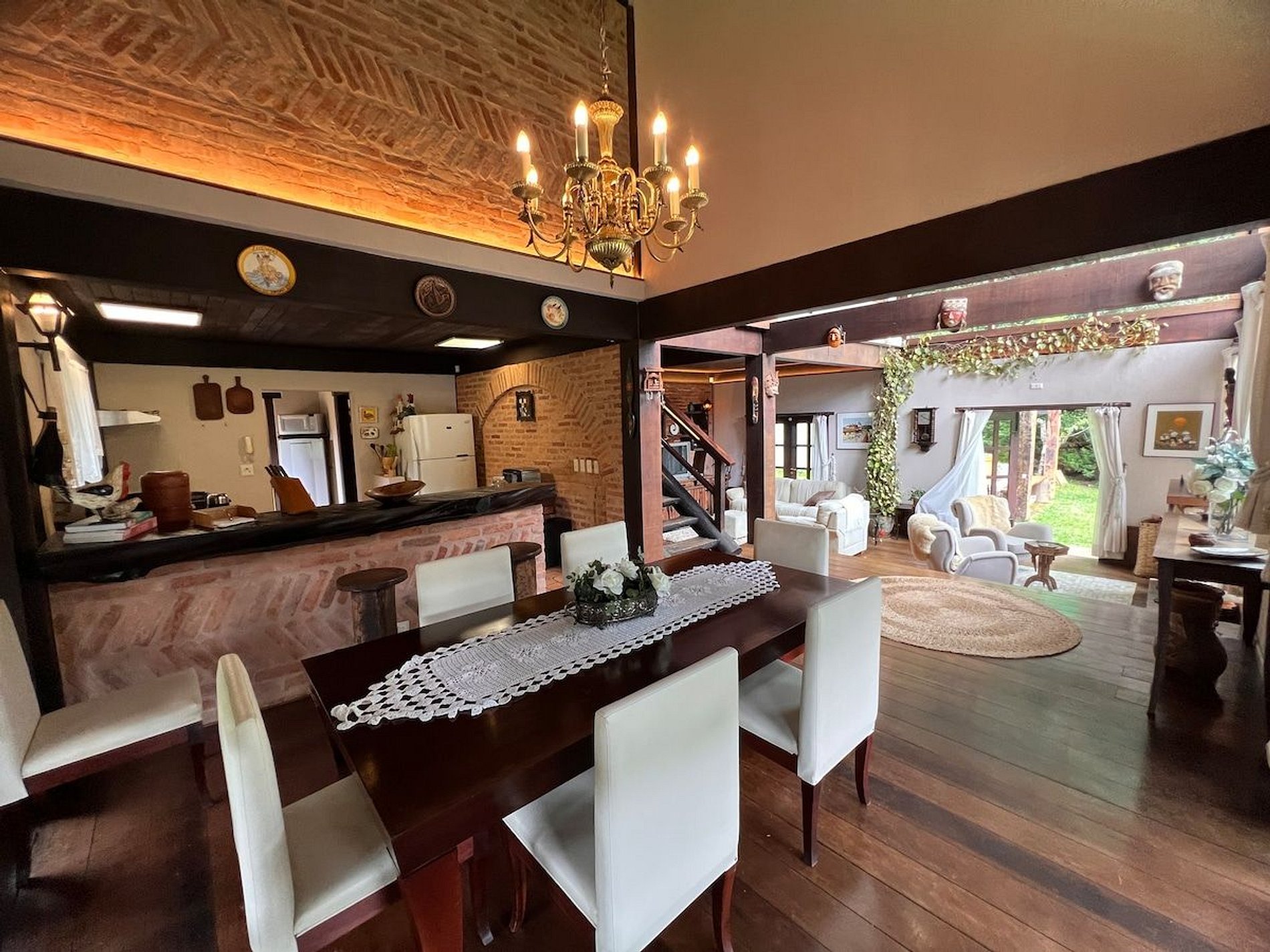 Cozinha estilo americana, copa com louças, travessas, copos e taças. No salão do jardim uma excelente mesa de bilhar, sala intima com lareira, um bar com Cave para adega compõem um ambiente que remete às vinícolas europeias. Com acesso direto ao deck e ao quiosque gourmet, o hóspede tem acesso ao fogão a lenha, forno de pizza, churrasqueira a carvão e à churrasqueira de bafo. Ôfuro Japonês no jardim privativo, possui ambiente para fogueira, laguinho, saída privativa para a trilha da reserva do condomínio(caminhada na floresta). Com acesso direto ao deck e ao quiosque gourmet, o hóspede tem acesso ao fogão a lenha, forno de pizza, churrasqueira a carvão e à churrasqueira de bafo.