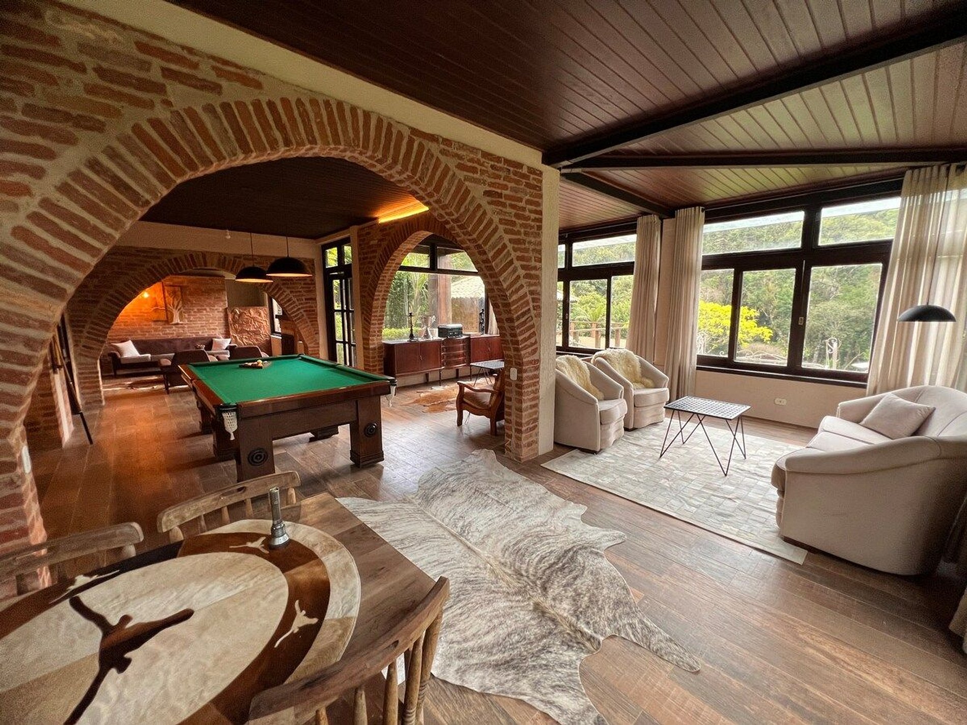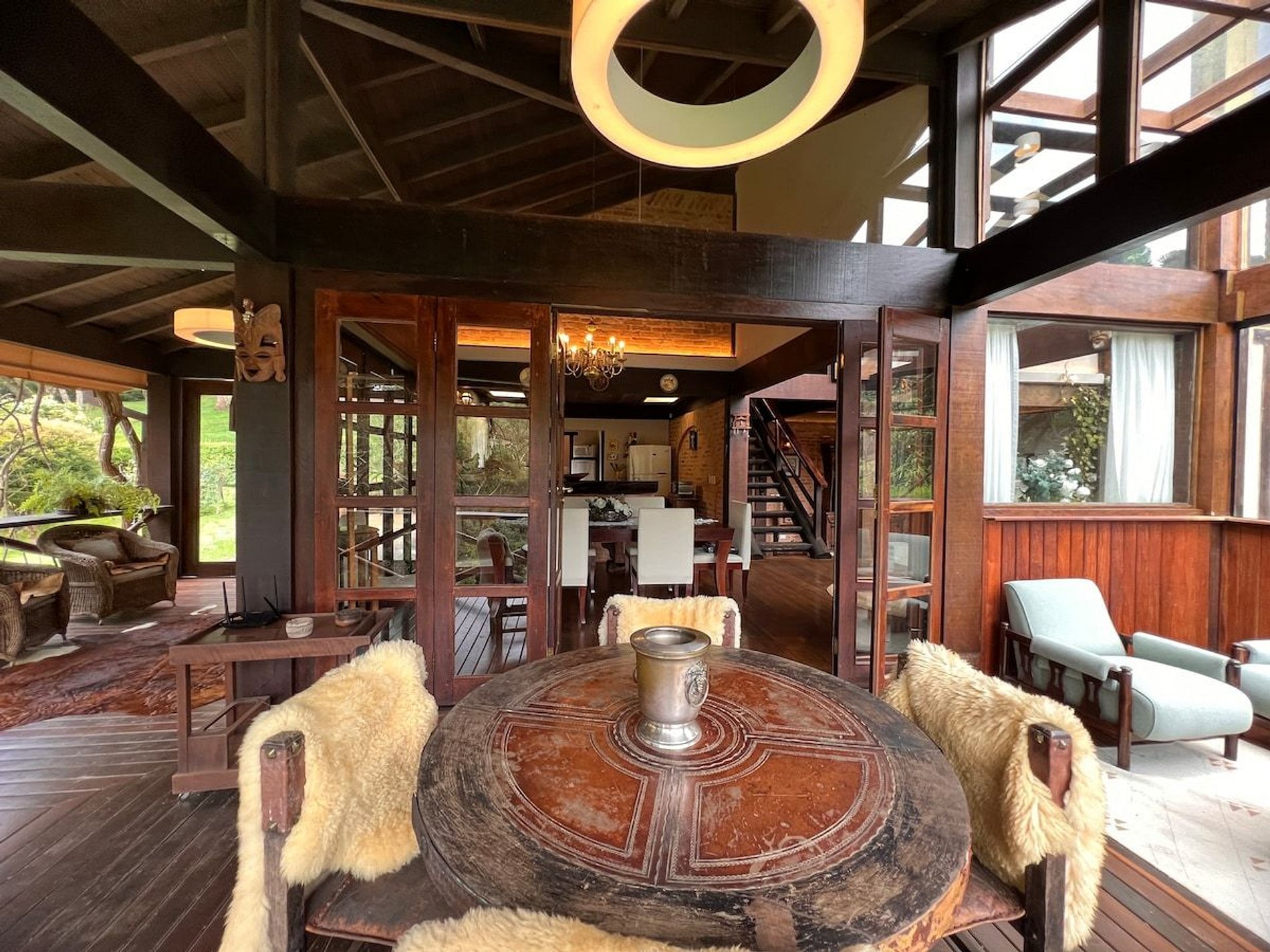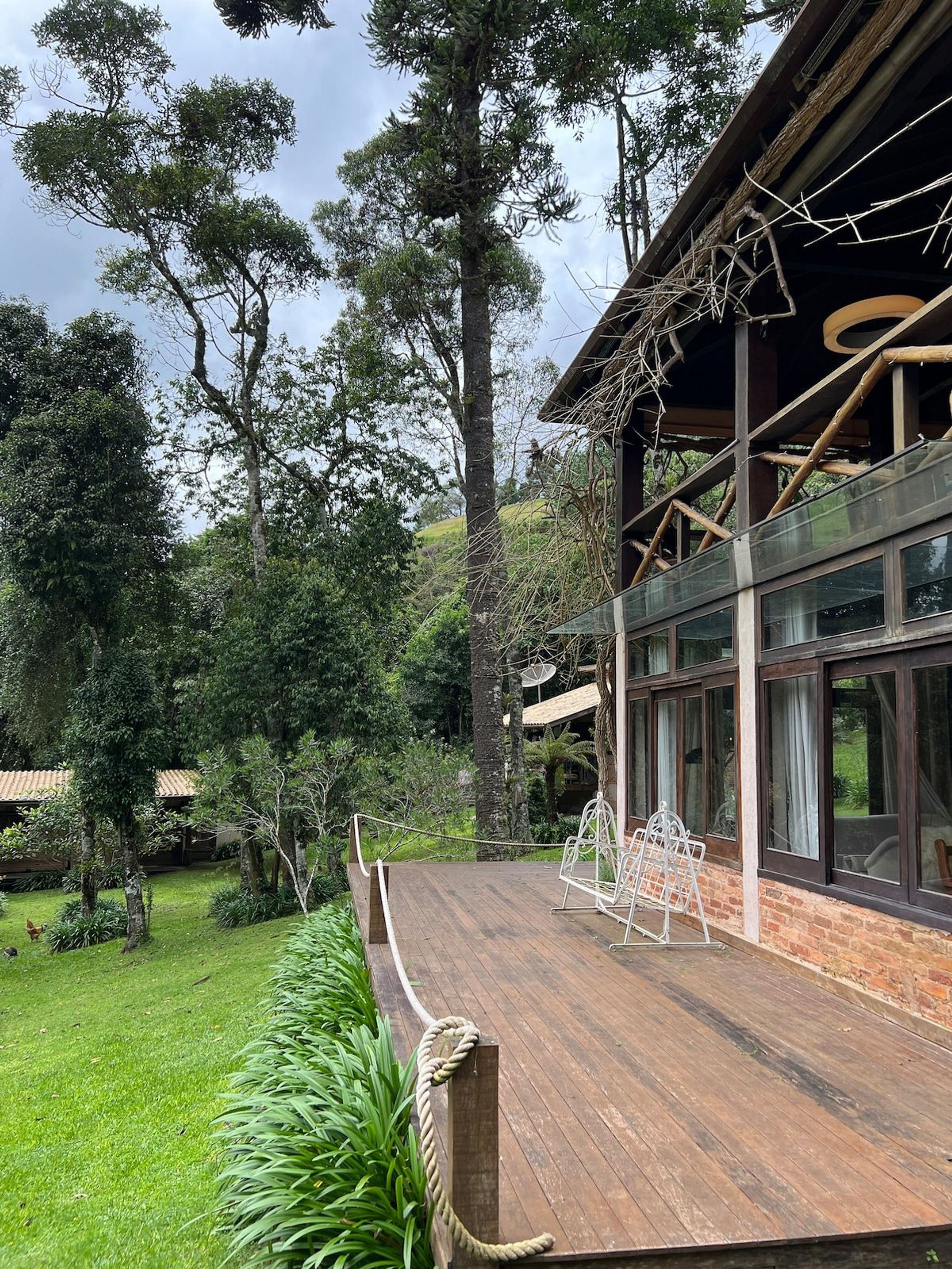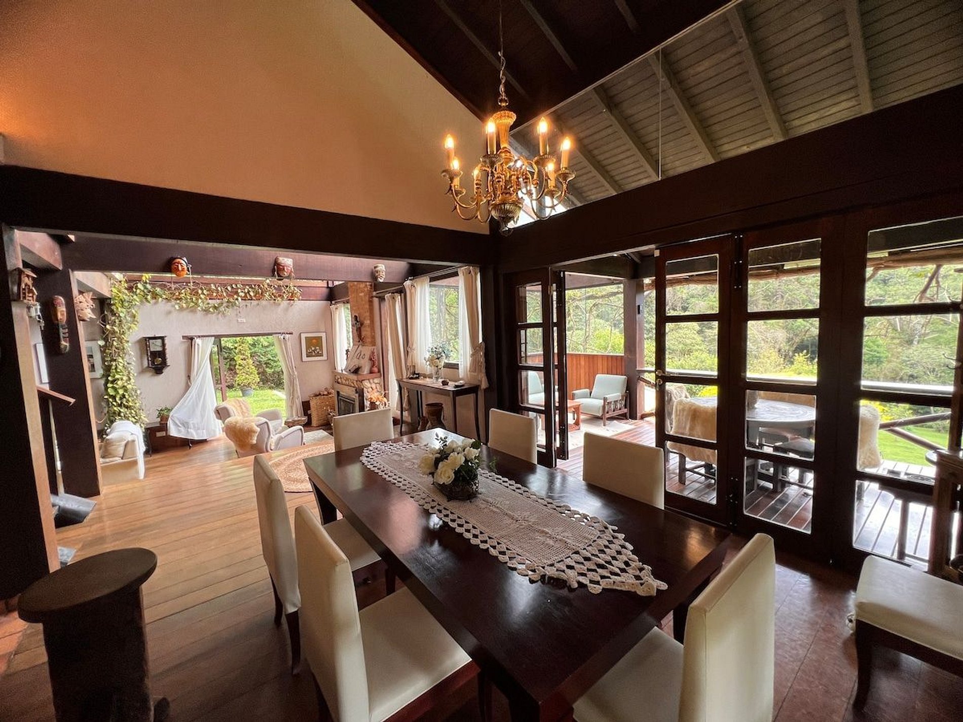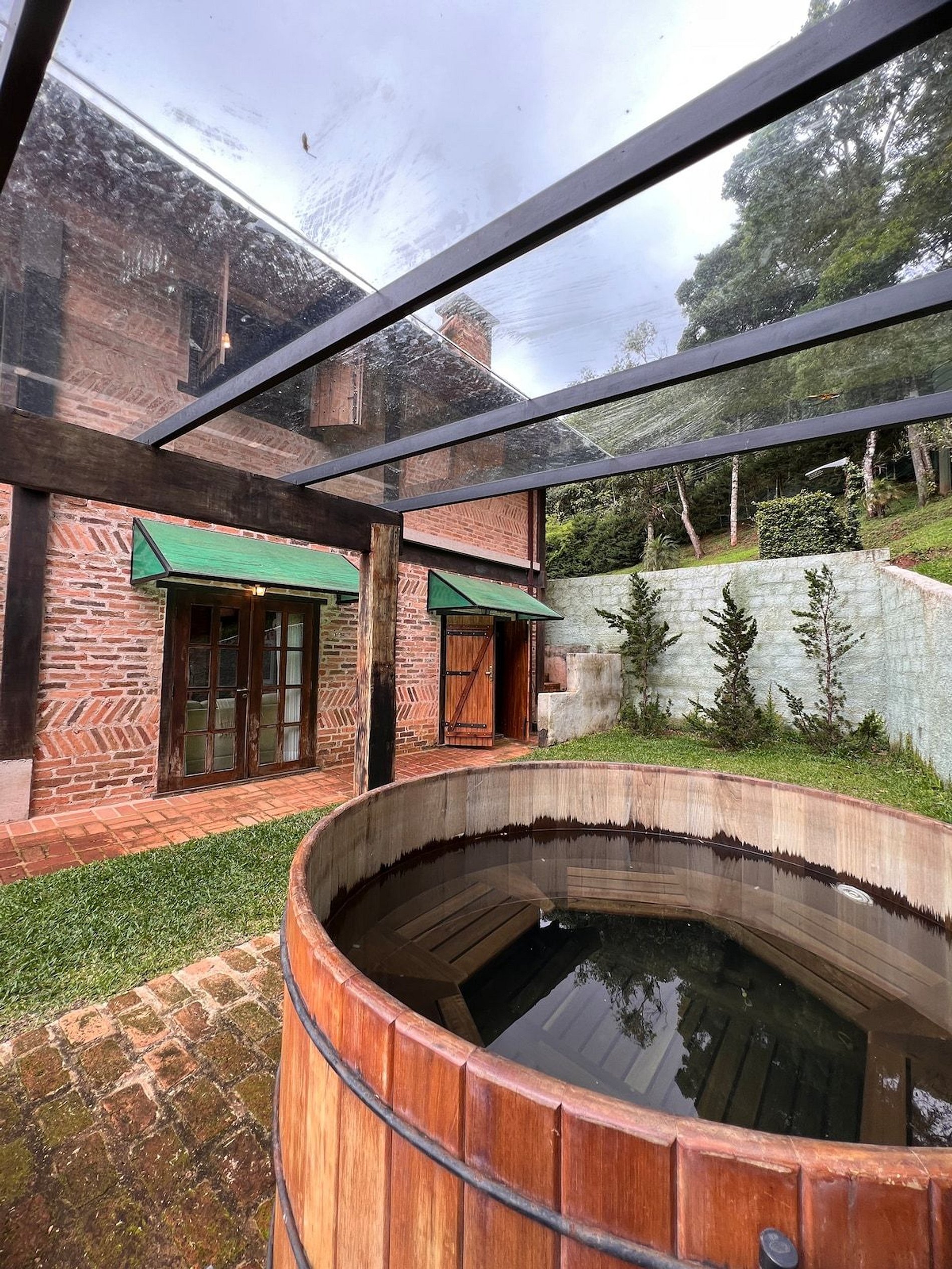 Cozinha estilo americana, copa com louças, travessas, copos e taças. No salão do jardim uma excelente mesa de bilhar, sala intima com lareira, um bar com Cave para adega compõem um ambiente que remete às vinícolas europeias. Com acesso direto ao deck e ao quiosque gourmet, o hóspede tem acesso ao fogão a lenha, forno de pizza, churrasqueira a carvão e à churrasqueira de bafo. Ôfuro Japonês no jardim privativo, possui ambiente para fogueira, laguinho, saída privativa para a trilha da reserva do condomínio(caminhada na floresta). Com acesso direto ao deck e ao quiosque gourmet, o hóspede tem acesso ao fogão a lenha, forno de pizza, churrasqueira a carvão e à churrasqueira de bafo.