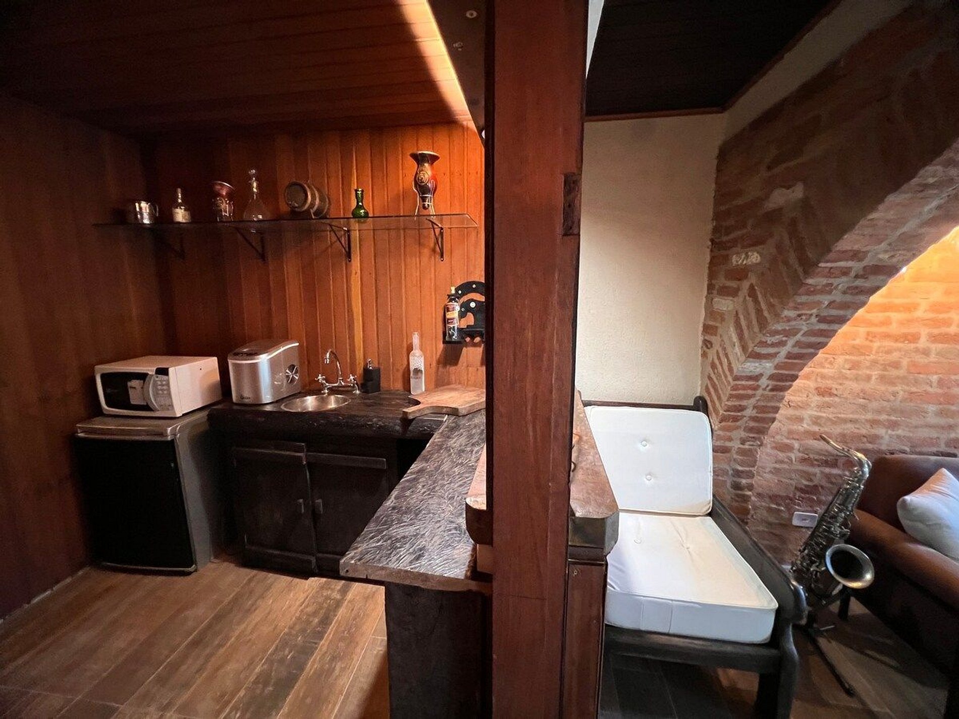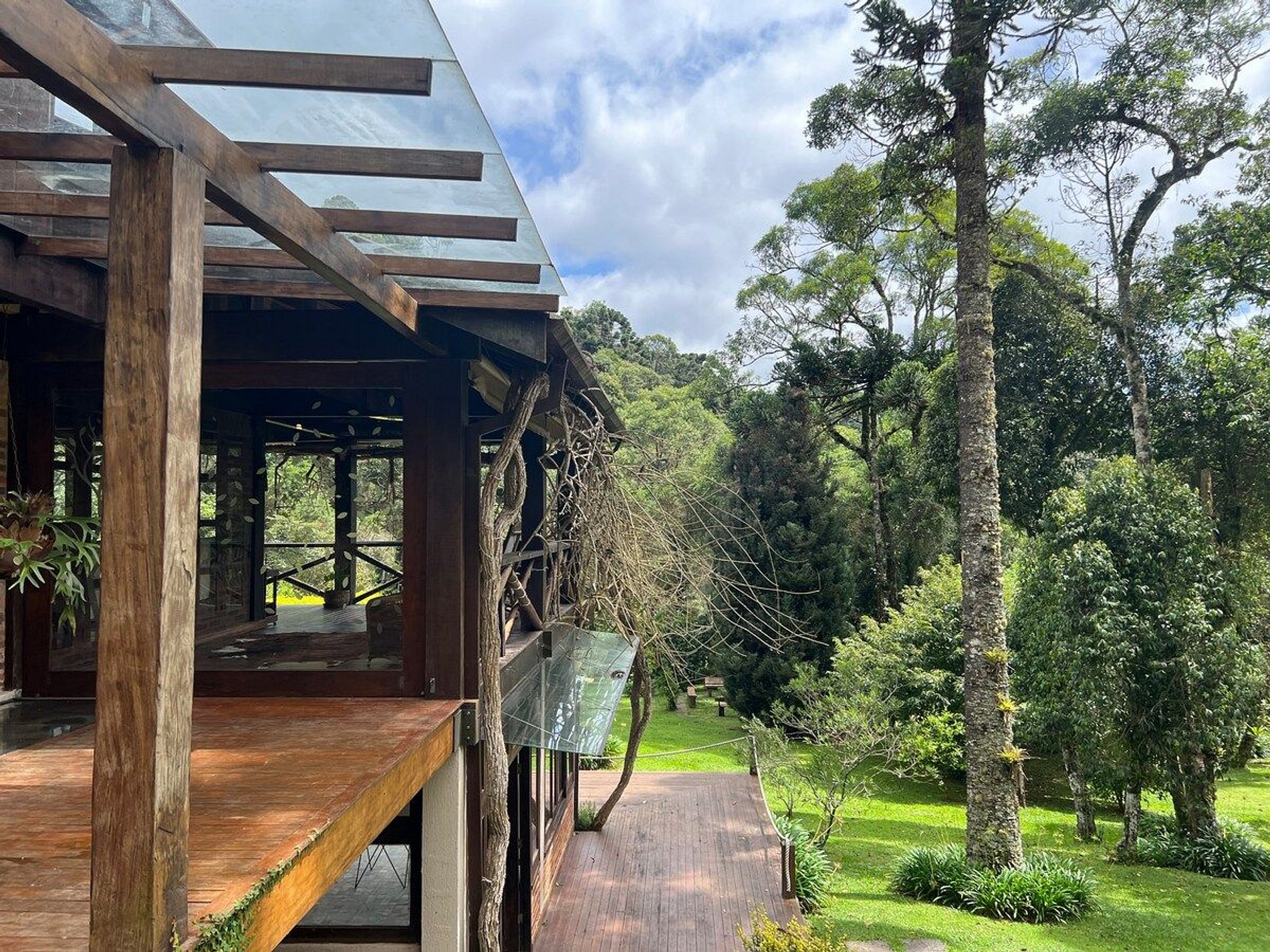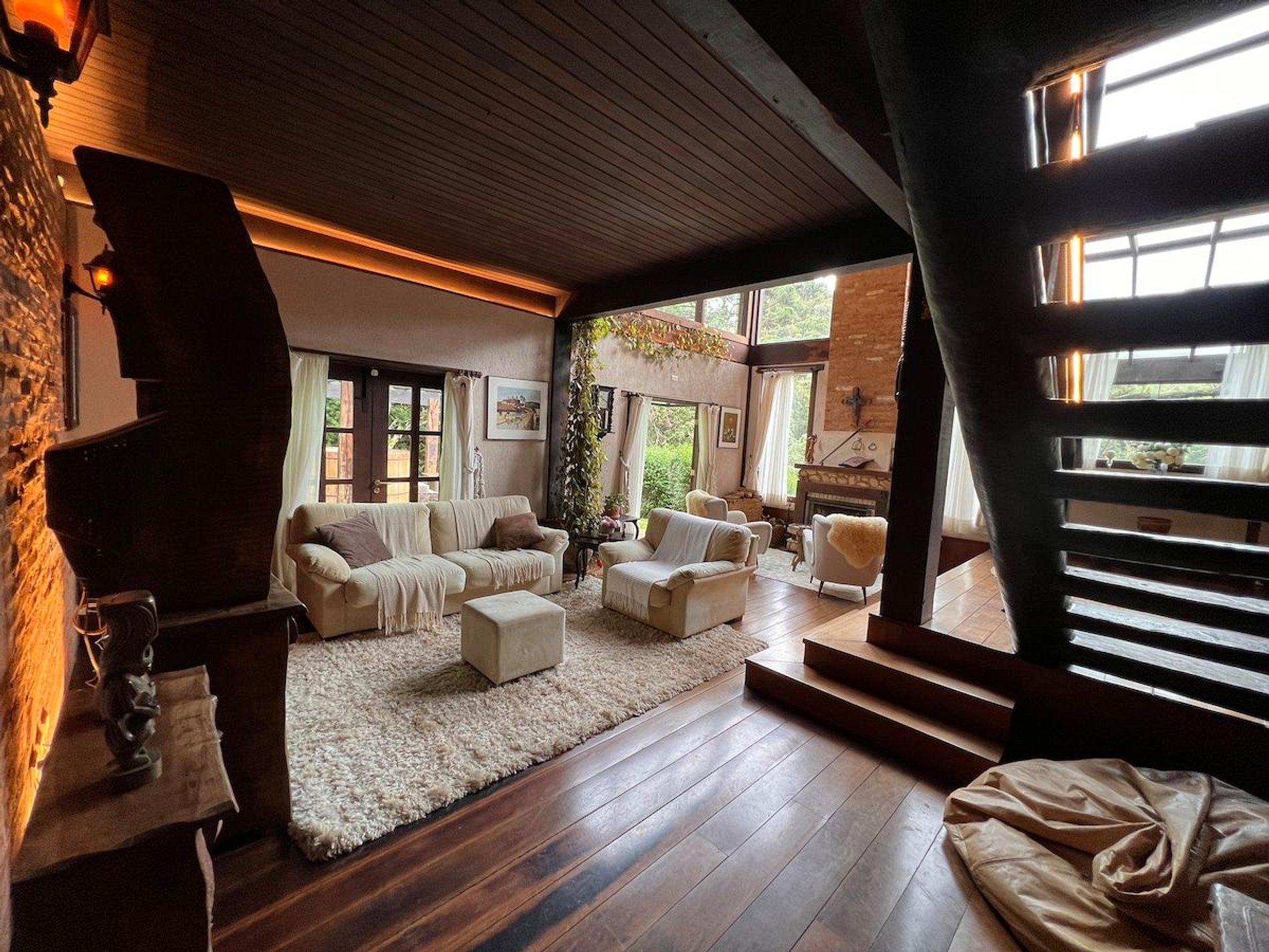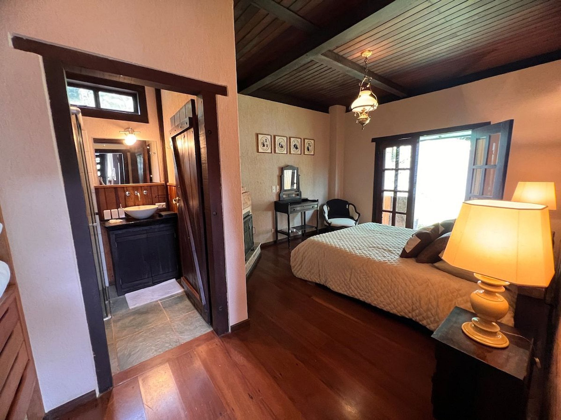Cozinha estilo americana, copa com louças, travessas, copos e taças. No salão do jardim uma excelente mesa de bilhar, sala intima com lareira, um bar com Cave para adega compõem um ambiente que remete às vinícolas europeias. Com acesso direto ao deck e ao quiosque gourmet, o hóspede tem acesso ao fogão a lenha, forno de pizza, churrasqueira a carvão e à churrasqueira de bafo. Ôfuro Japonês no jardim privativo, possui ambiente para fogueira, laguinho, saída privativa para a trilha da reserva do condomínio(caminhada na floresta). Com acesso direto ao deck e ao quiosque gourmet, o hóspede tem acesso ao fogão a lenha, forno de pizza, churrasqueira a carvão e à churrasqueira de bafo.