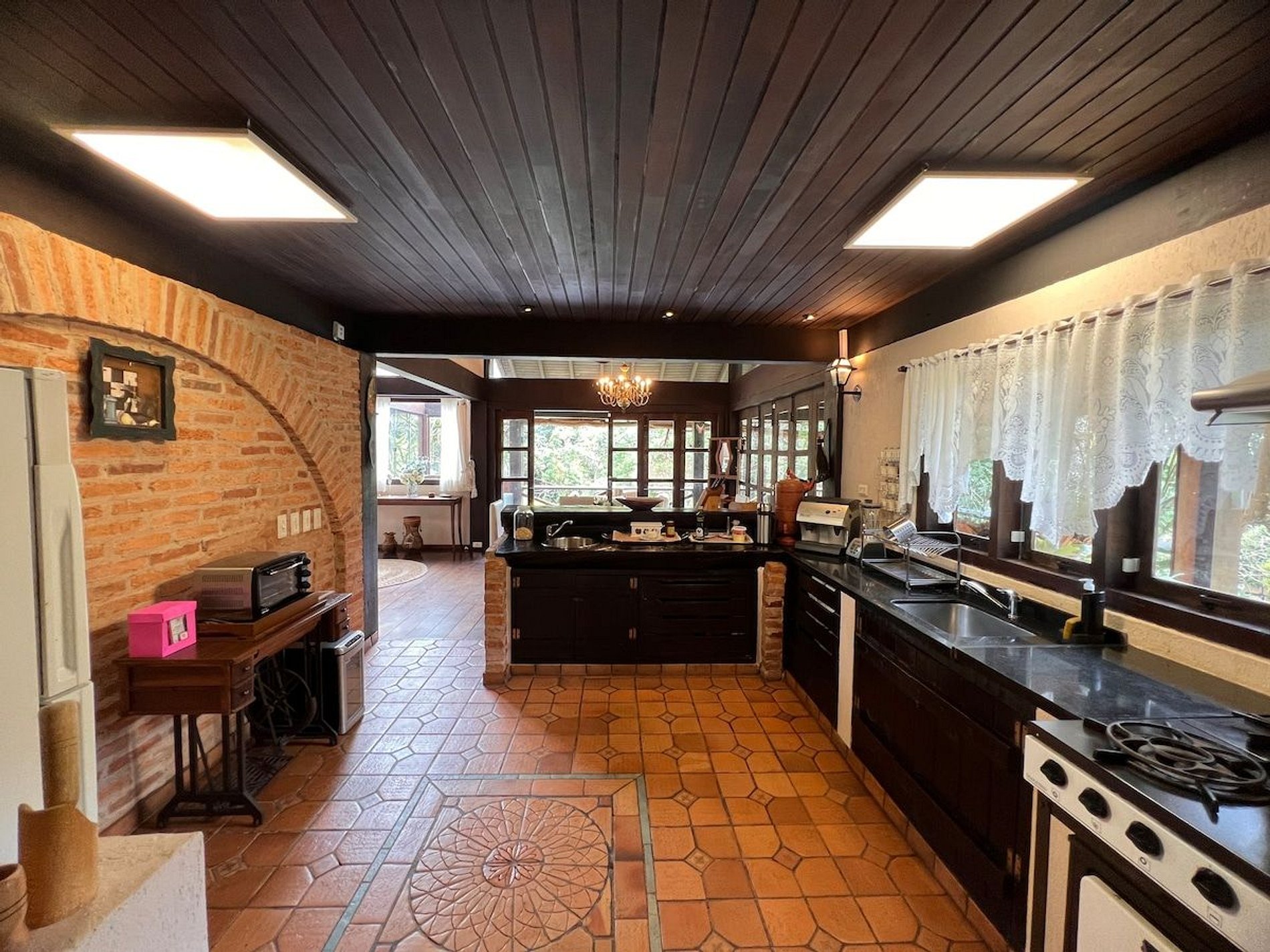 Cozinha estilo americana, copa com louças, travessas, copos e taças. No salão do jardim uma excelente mesa de bilhar, sala intima com lareira, um bar com Cave para adega compõem um ambiente que remete às vinícolas europeias. Com acesso direto ao deck e ao quiosque gourmet, o hóspede tem acesso ao fogão a lenha, forno de pizza, churrasqueira a carvão e à churrasqueira de bafo. Ôfuro Japonês no jardim privativo, possui ambiente para fogueira, laguinho, saída privativa para a trilha da reserva do condomínio(caminhada na floresta). Com acesso direto ao deck e ao quiosque gourmet, o hóspede tem acesso ao fogão a lenha, forno de pizza, churrasqueira a carvão e à churrasqueira de bafo.